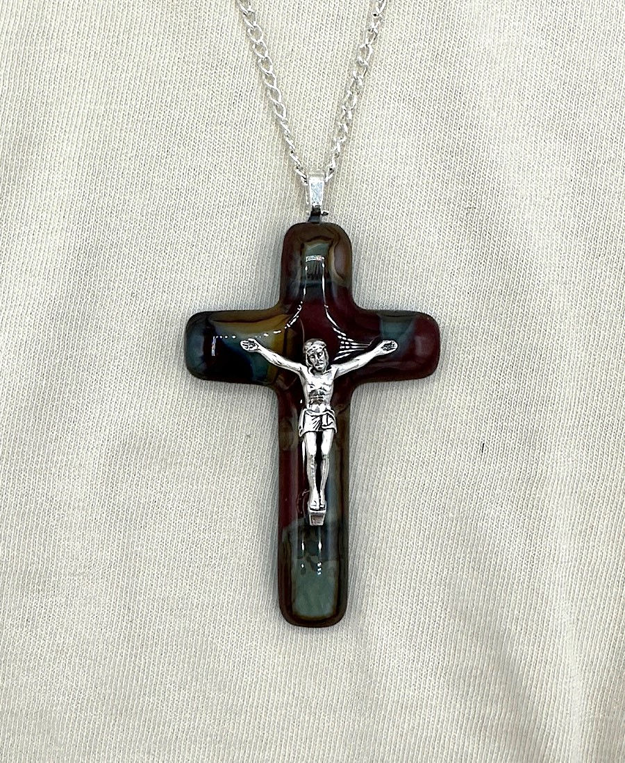 Brown Rustic Glass Christian Cross Necklace - Handmade - Qty Discounts Available